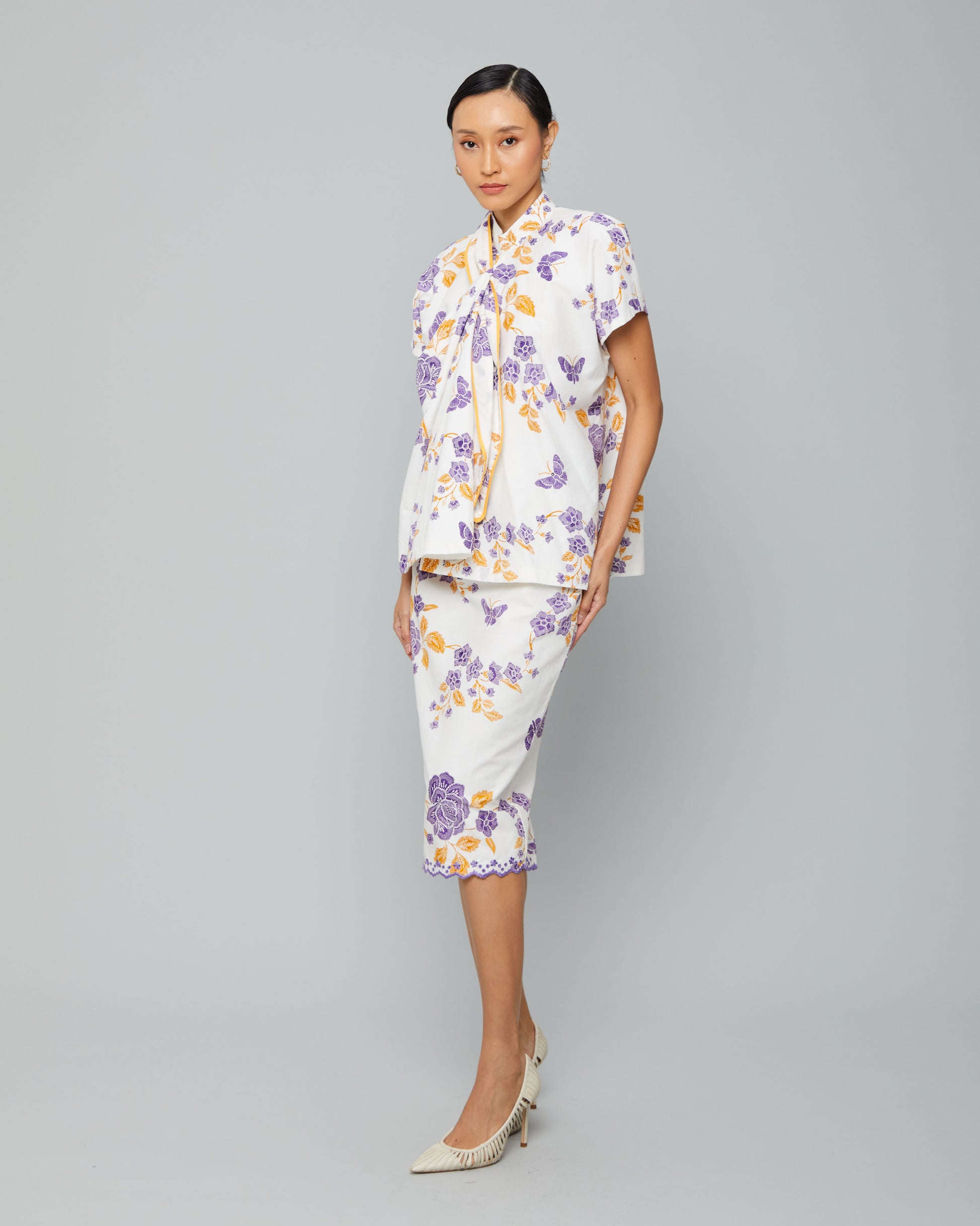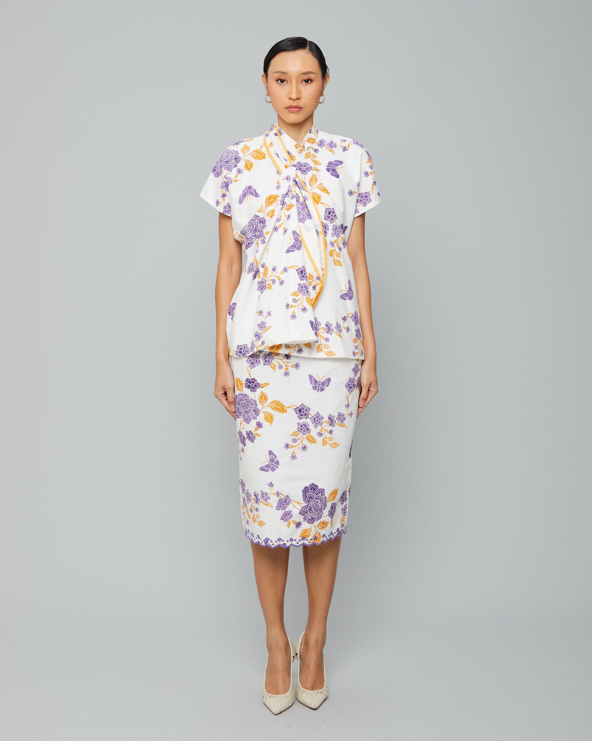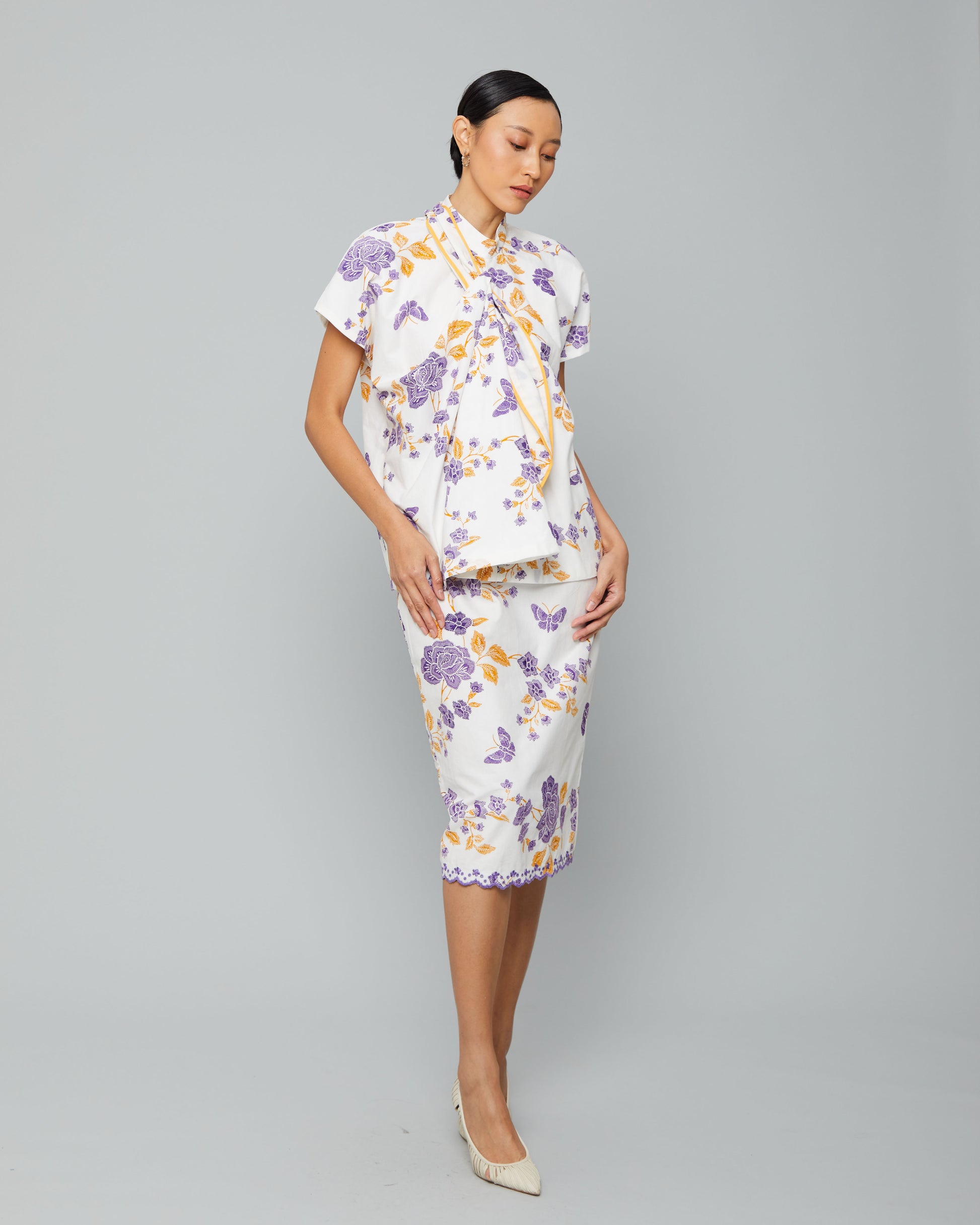 Anggun Skirt – batik skirt with elegant floral motifs in vibrant purple and yellow, perfect for pairing with matching tops for a cohesive and elegant look.