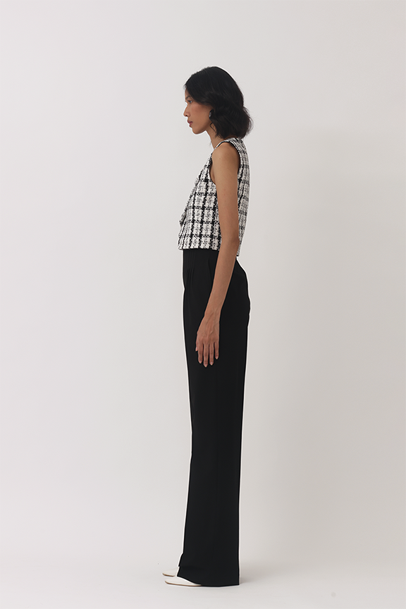A modern take on classic tailoring, this tweed sleeveless top blends structure with versatility. Crafted from textured tweed in a bold black-and-white pattern, it features a cropped silhouette with a sharp V-neckline and a statement front slit, adding an unexpected edge to the timeless fabric. The tailored fit enhances the waist, while the button closure provides a polished finish.