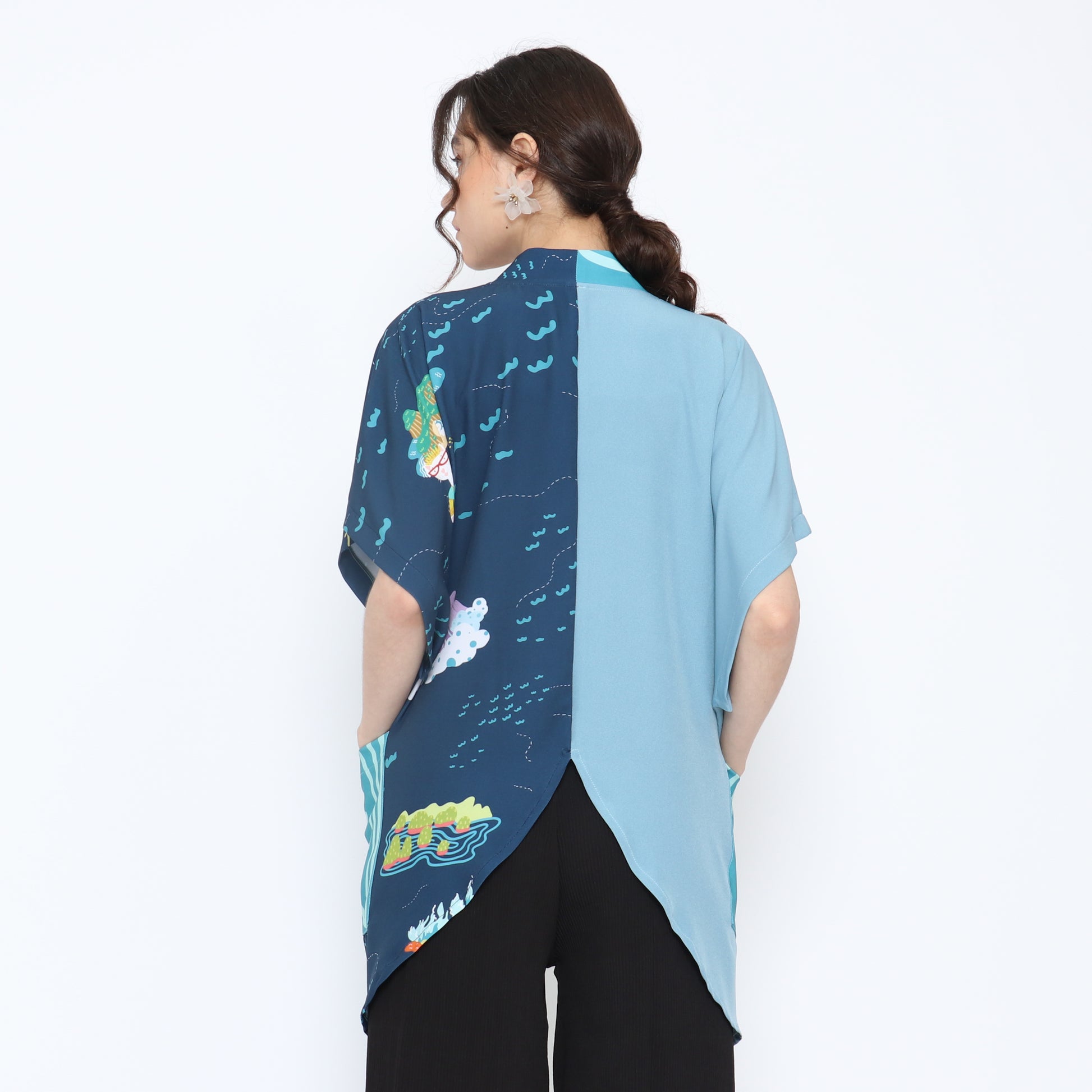 A Loose and easy to wear outer with pocket and vibrant print from our 'Plesiran' collection. Spot the feline character 'Si Meong' as you trail the illustrated scenery on the backside, also features scallop shaped hemline on the back.