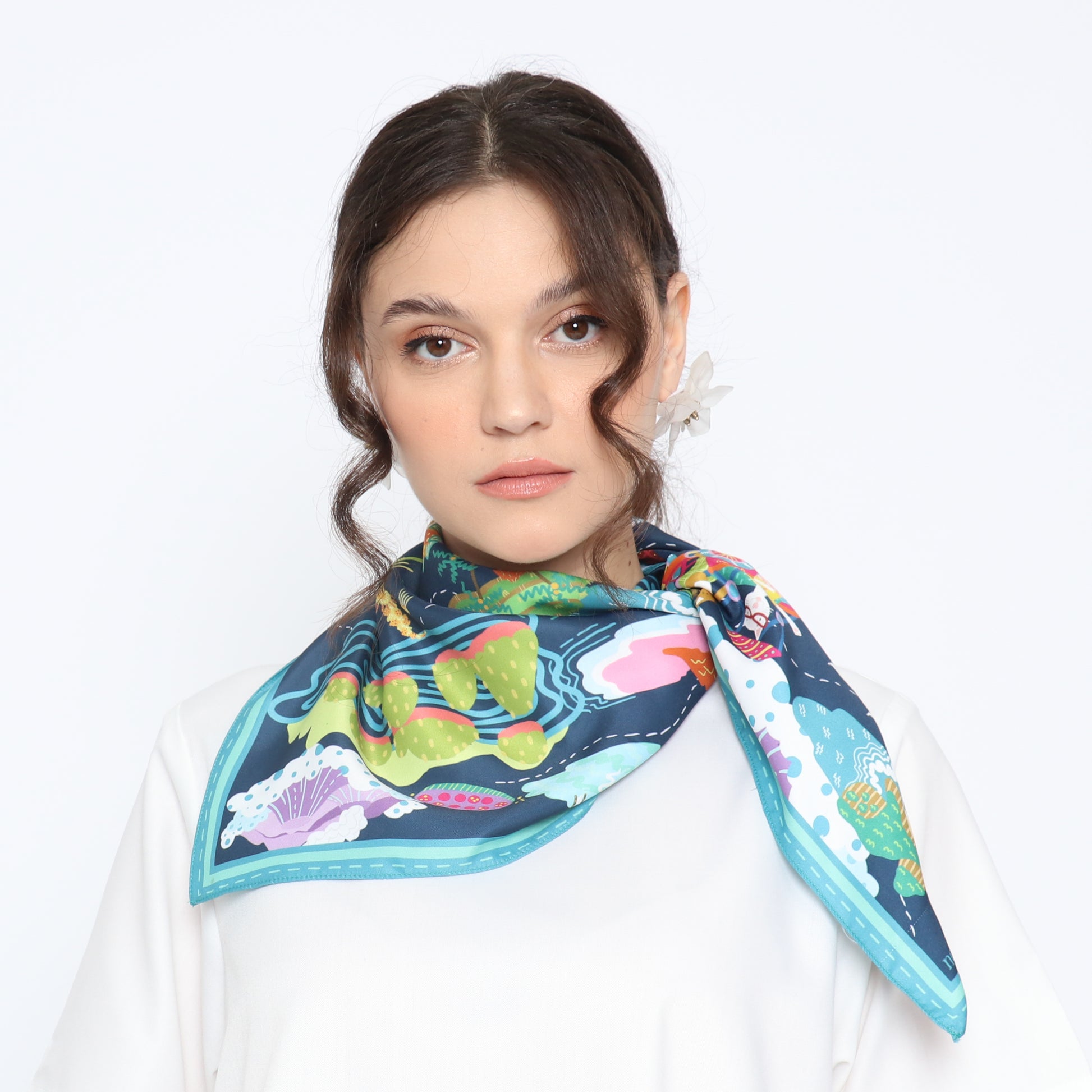 A multifunction scarf with 68x68cm size, illustrated with our 'Plesiran' print, which is inspired by the beauty of Indonesian culture and iconic places. Follow the trail of the feline character "Si Meong" as she go places and experience Indonesia.