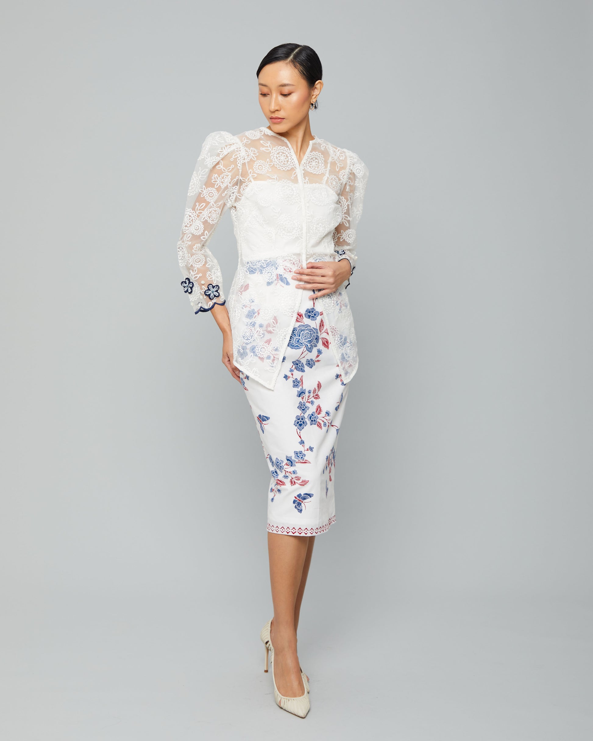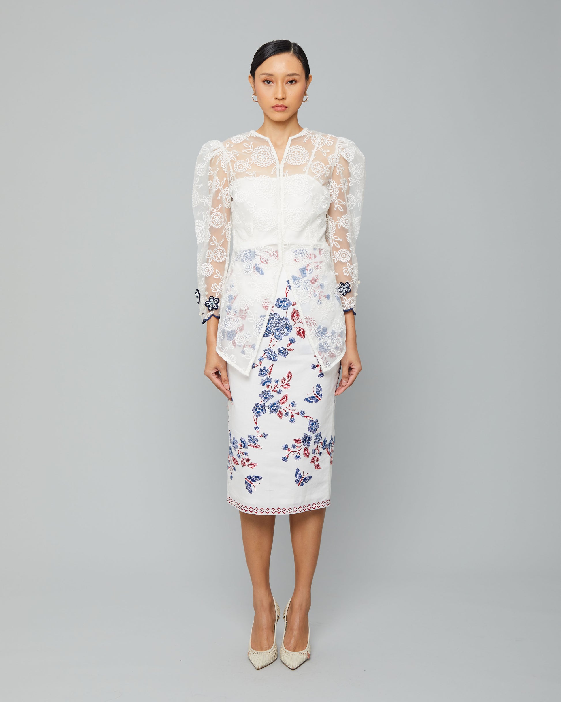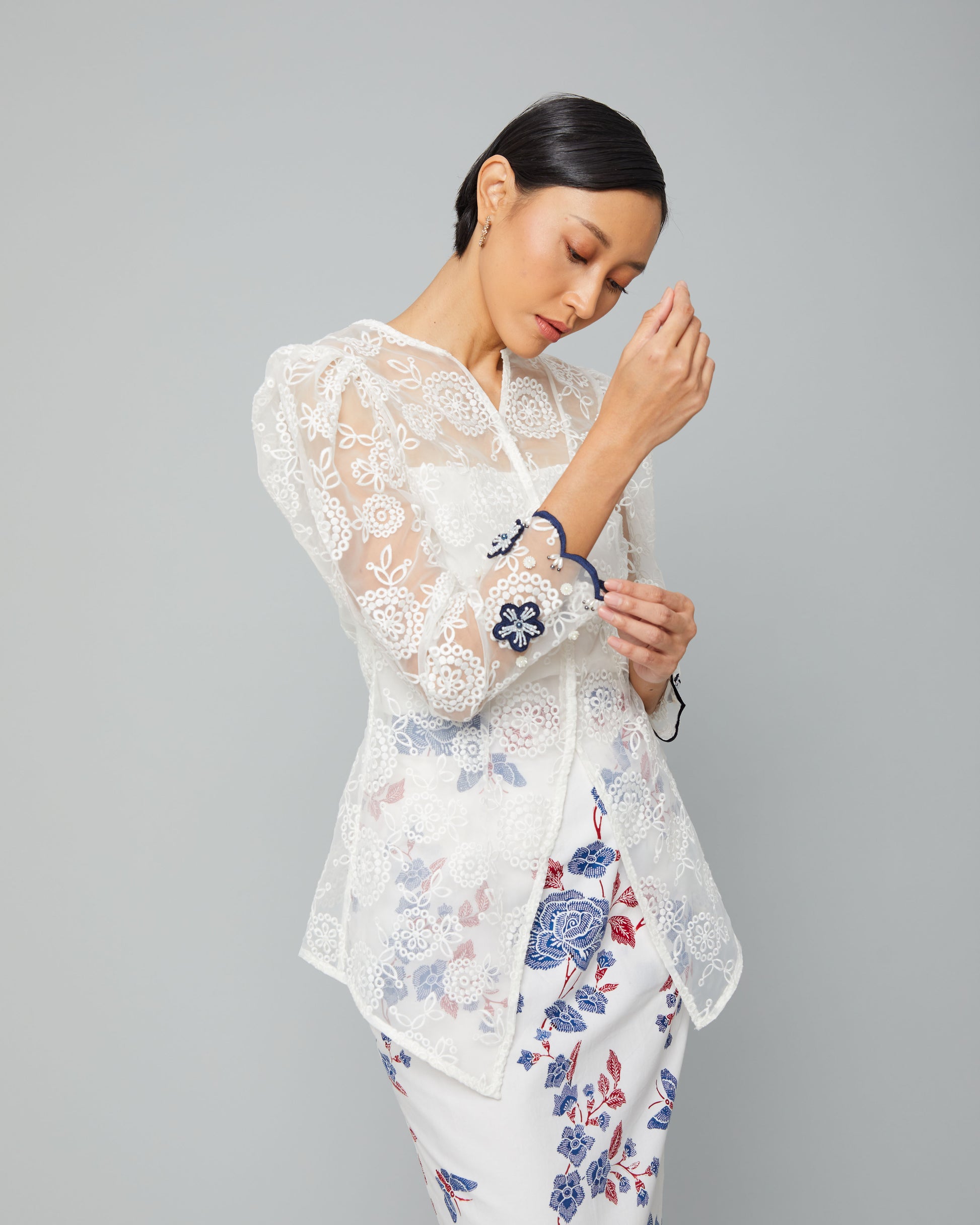 Rami Top is crafted from embroidered organdy, featuring a refined silhouette and elegant floral accents on the sleeves. A graceful choice to complement your batik look with a soft, feminine charm.