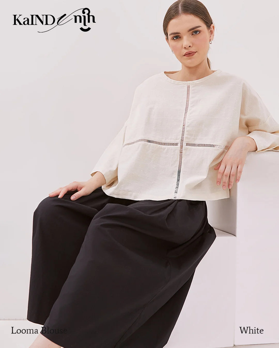 Ce chemisier tissé main allie élégance intemporelle et charme minimaliste. Sa silhouette décontractée et carrée respire le confort et la sophistication. Le devant est orné de délicats détails en maille ajourée qui créent des accents linéaires, apportant une texture subtile et une touche artisanale au modèle. Les larges manches trois-quarts et l'ourlet asymétrique lui confèrent une allure raffinée.