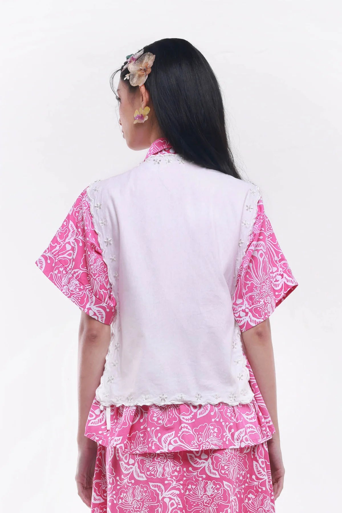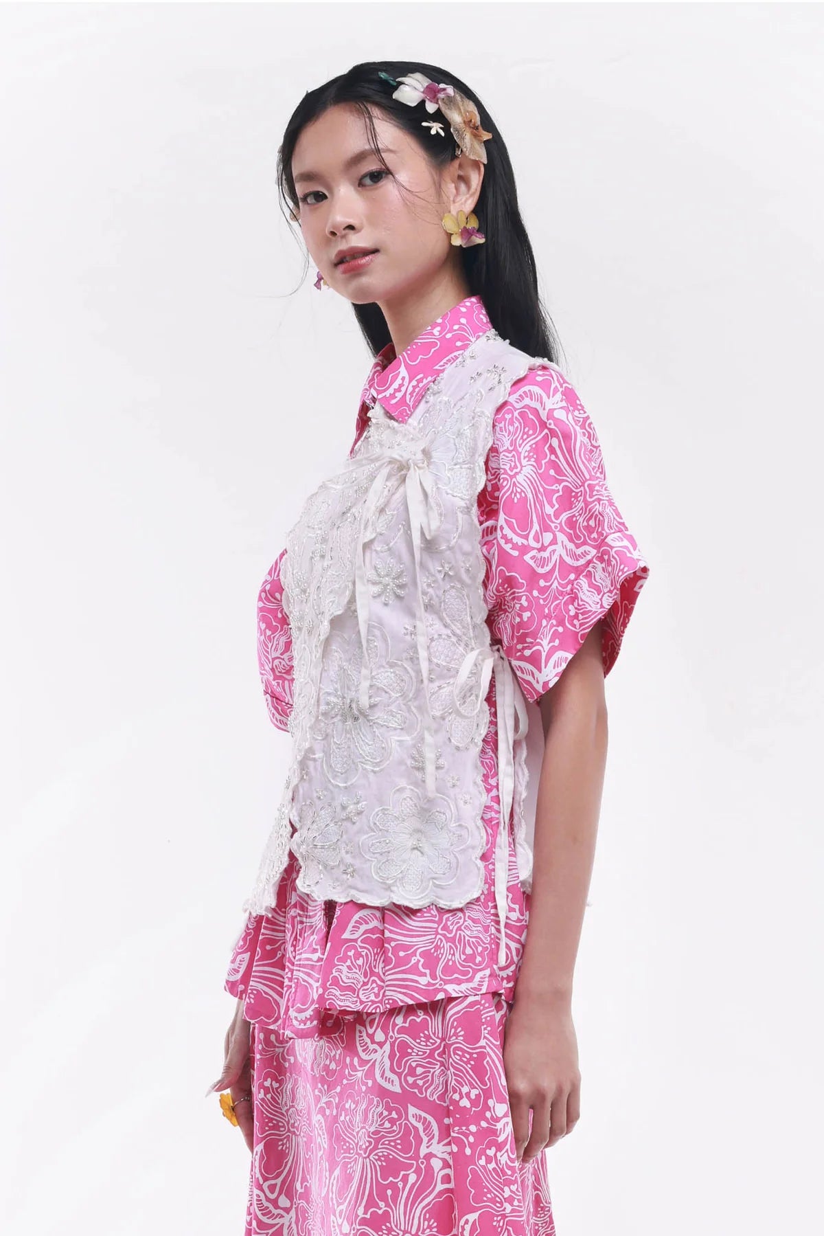 Spécialement conçu pour notre défilé NYFW SS23, notre haut à fleurs Suedeson a été entièrement brodé en interne. Une œuvre d'art à porter.