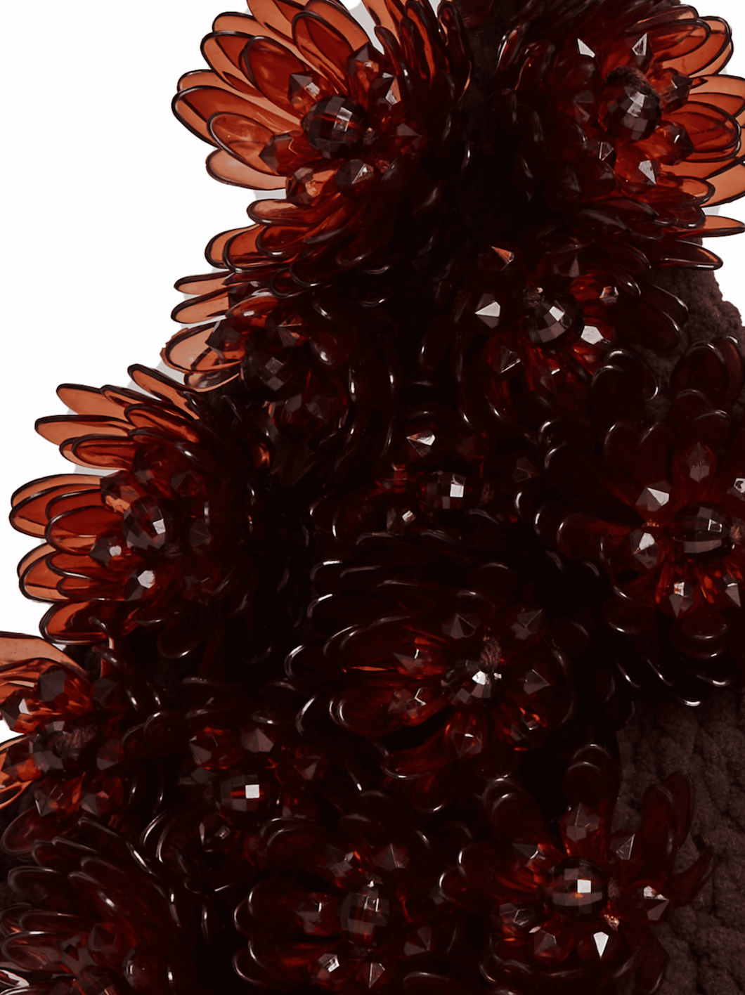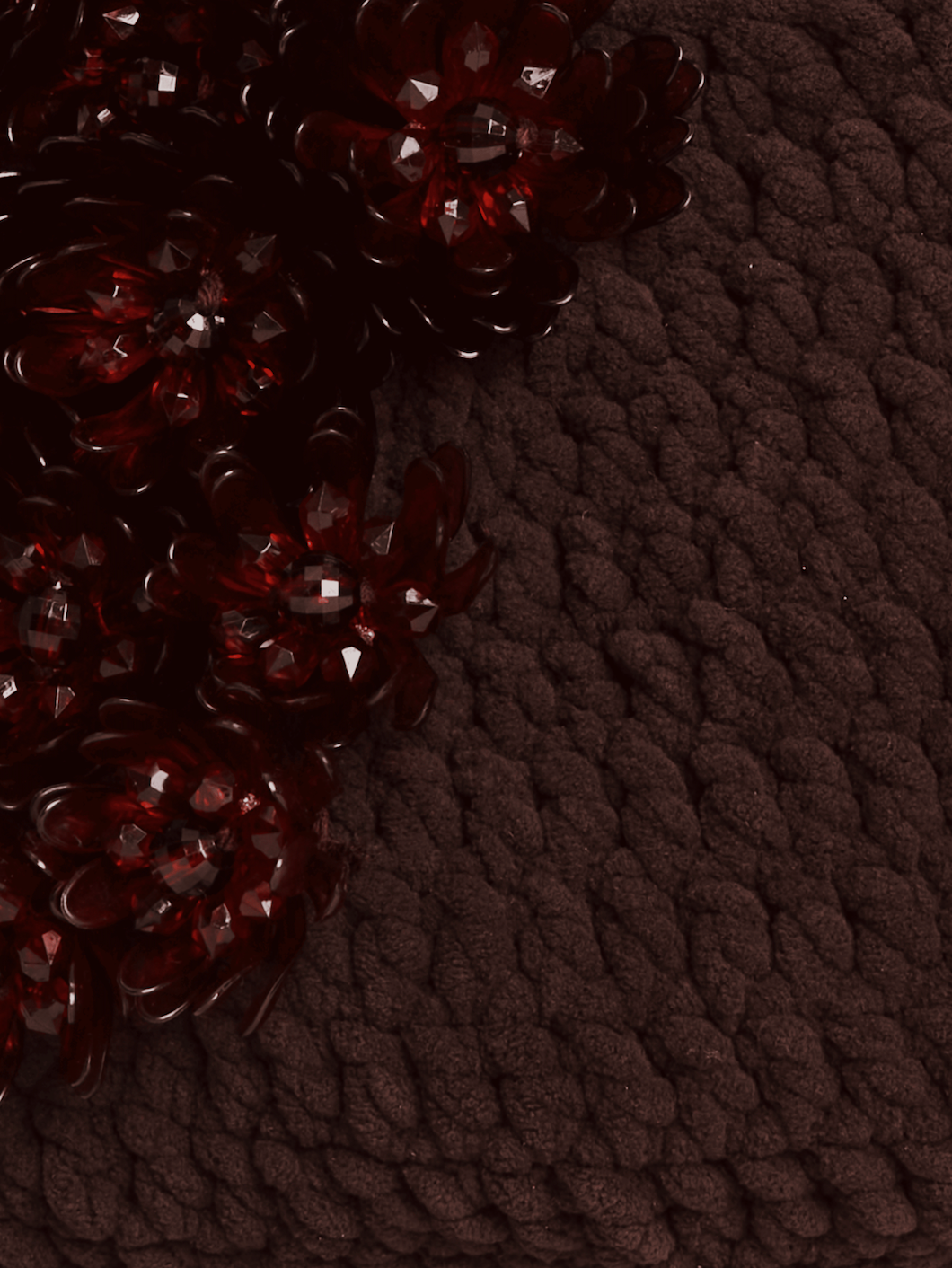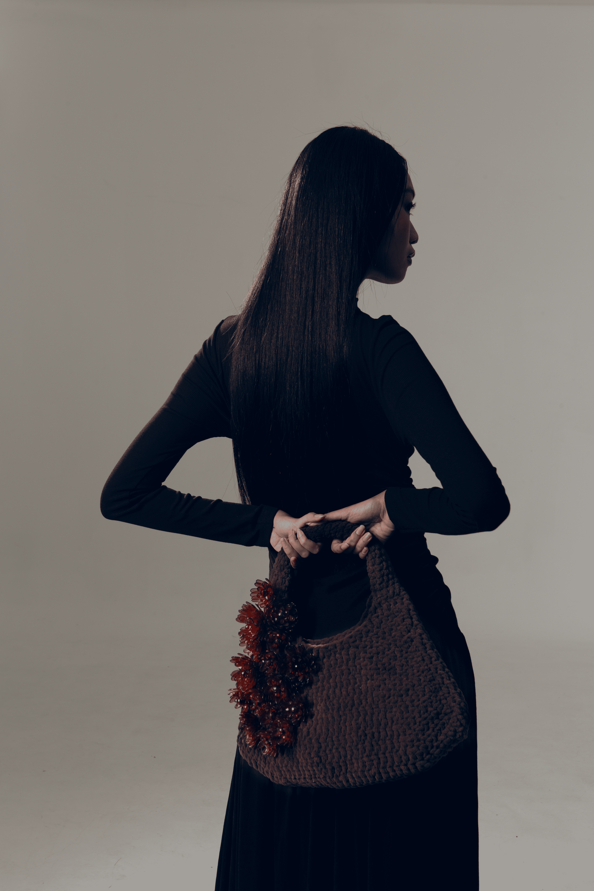 Shoulder bag crafted using crochet technique. It comes in a large size, making it capable of carrying various items. Featuring detailed acrylic and resin flower petal embellishments and equipped with a magnetic button closure.