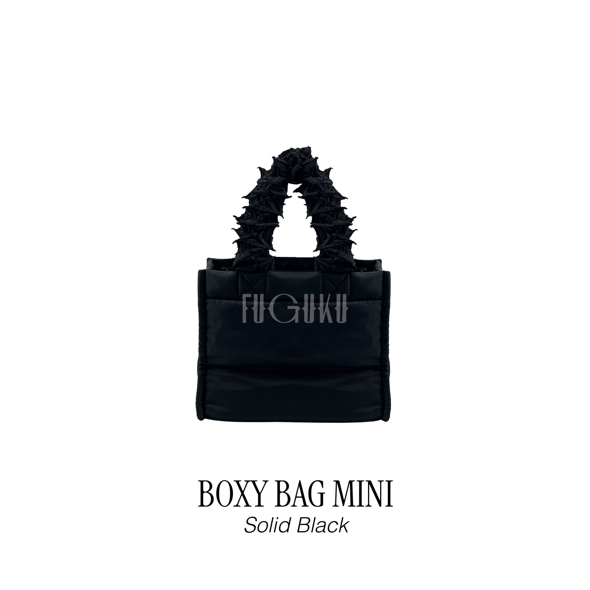 This boxy bag features a striking spiky handle and high functionality, reinforced by a detachable base and internal pockets. Made from recycled plastic fabric, including its signature puffy details, this bag is safe with a magnetic closure.