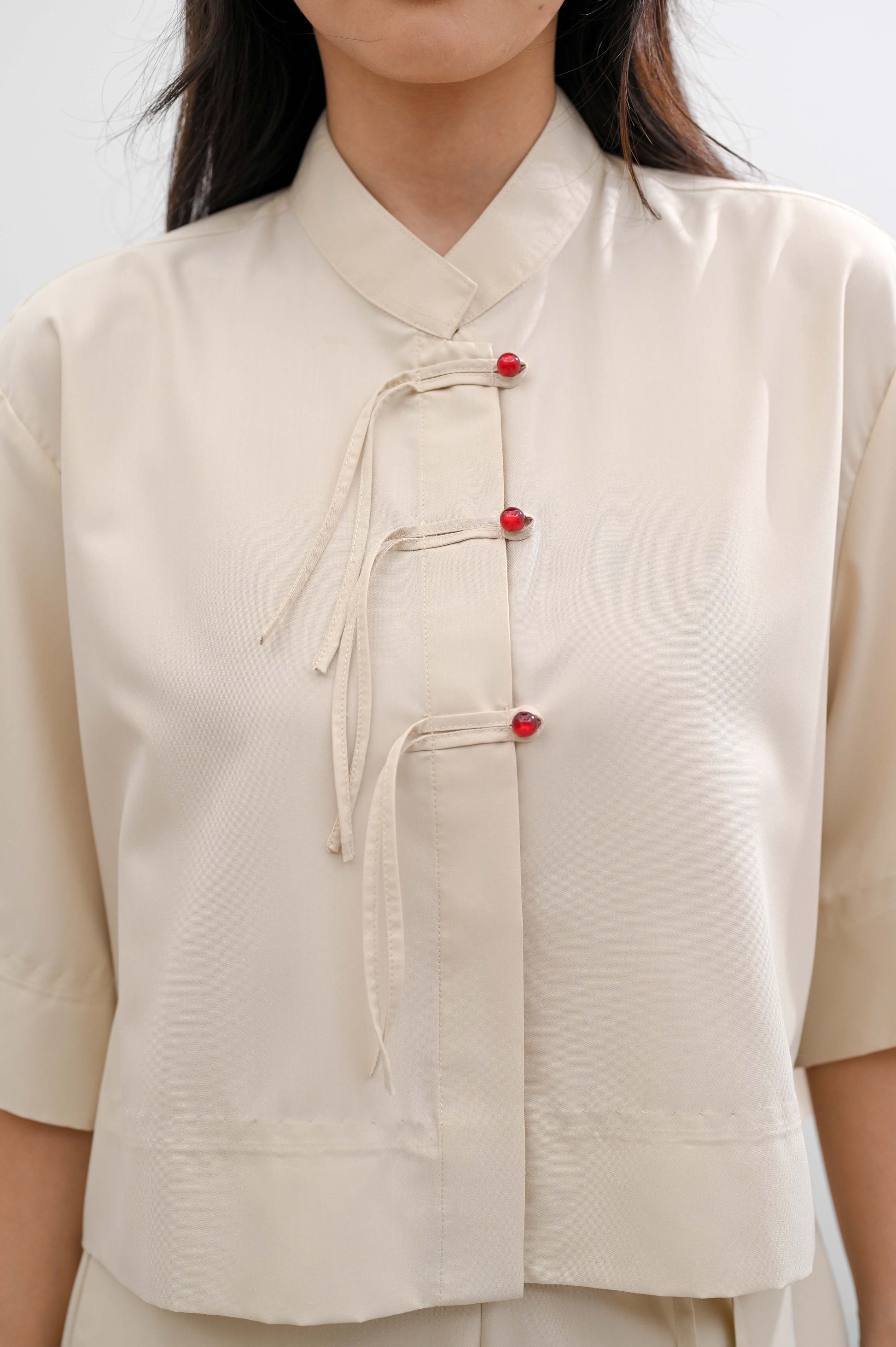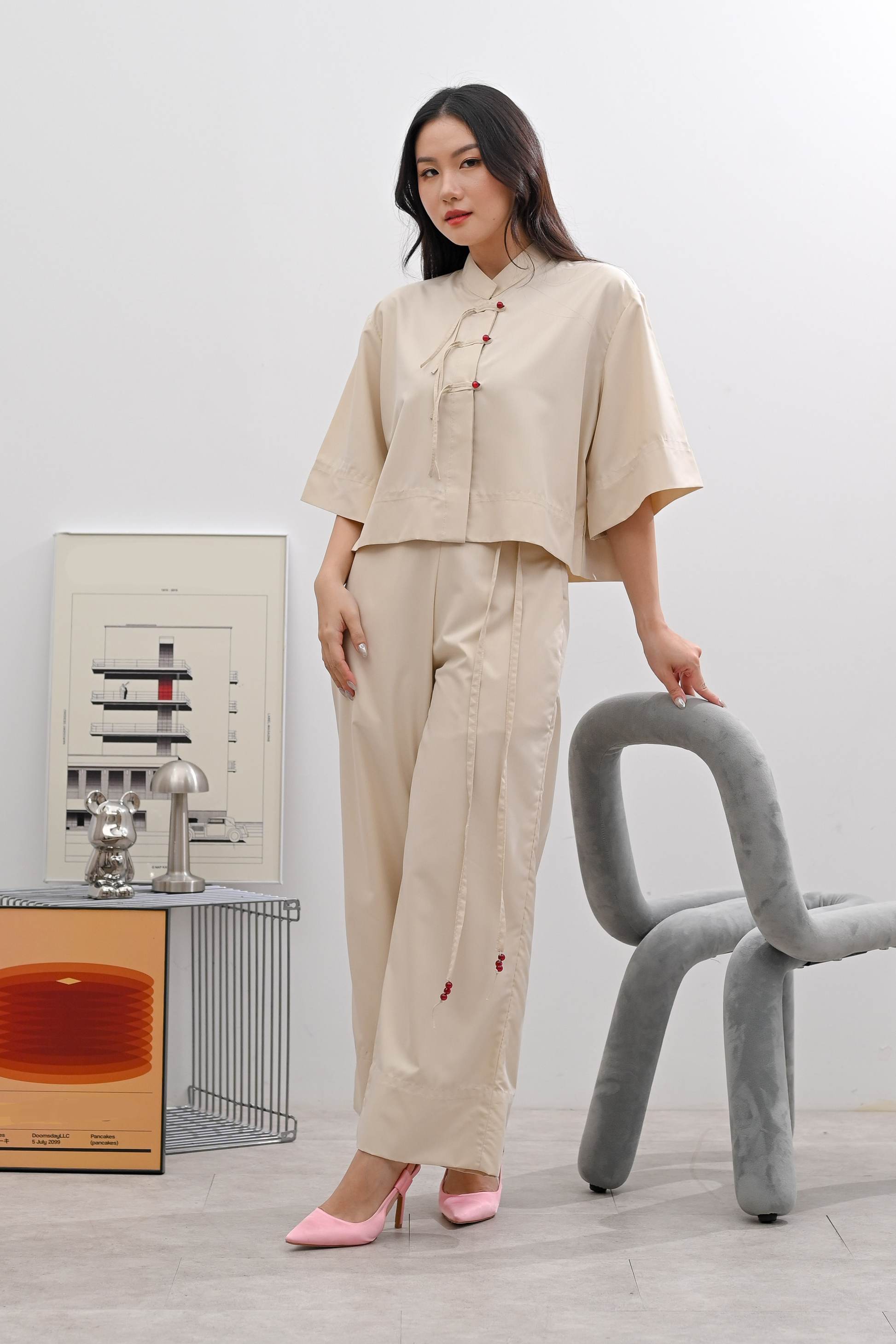 Meet the Candice Top is a simple and elegant design for Lunar New Year. Featuring overlaped shanghai collar with a cheongsam button. The boxy fit and wide short sleeves create a relaxed yet neat look, while the soft neutral color makes it easy to style for both festive and everyday wear.