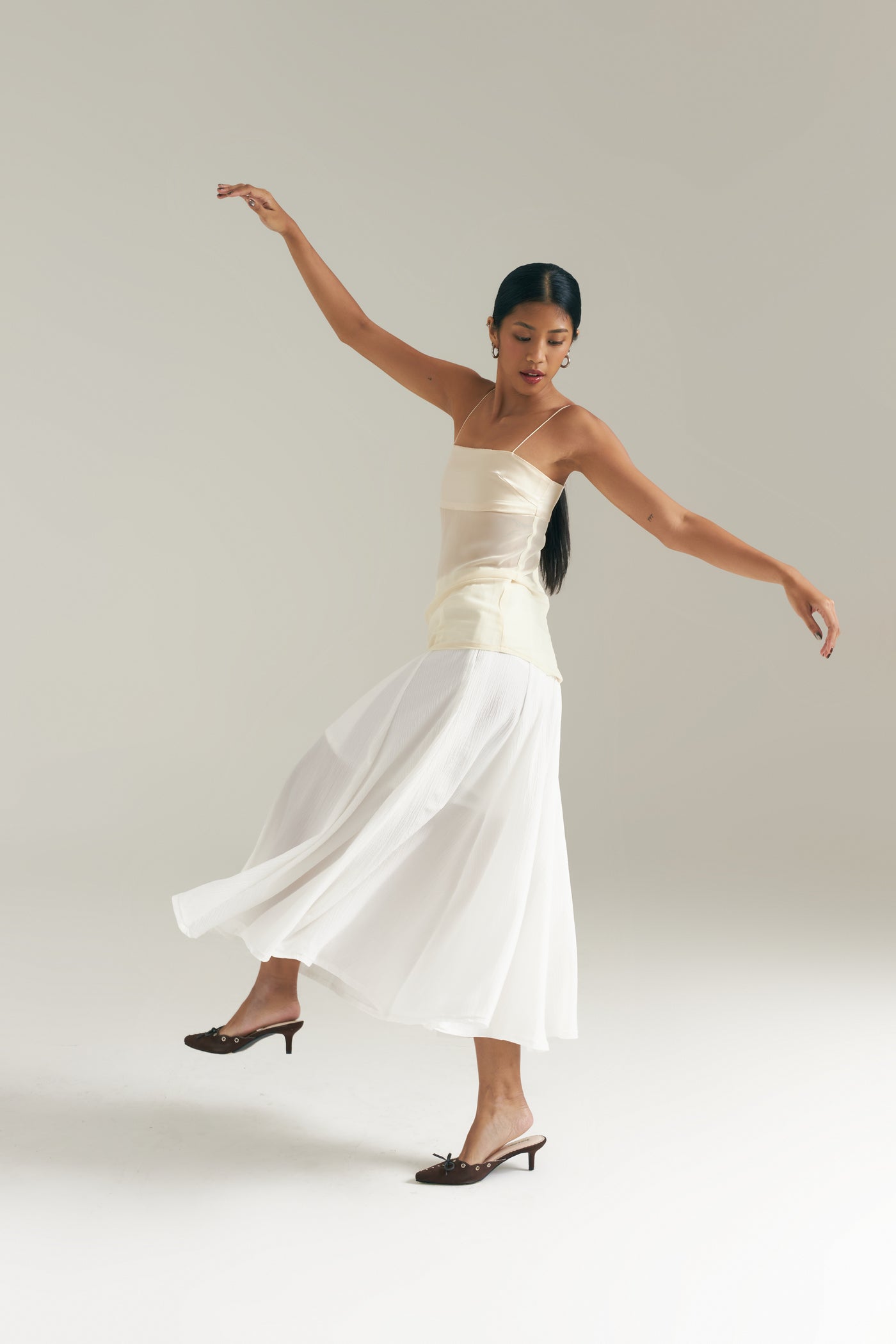 Isla top features a structured bandeau neckline that flows into a sheer, subtly flared silhouette body