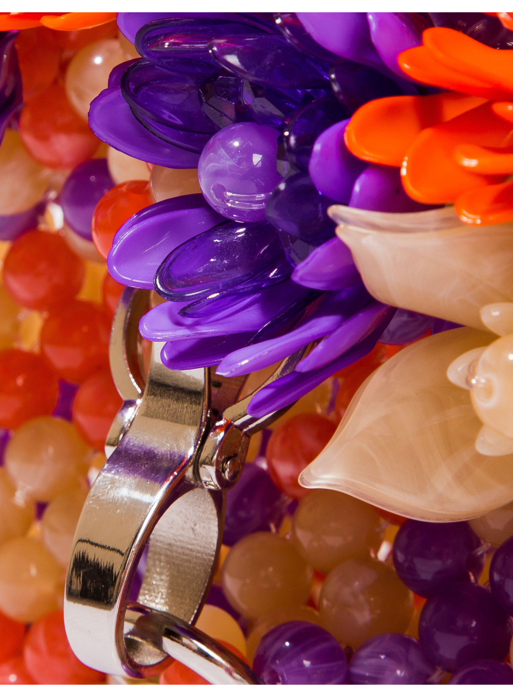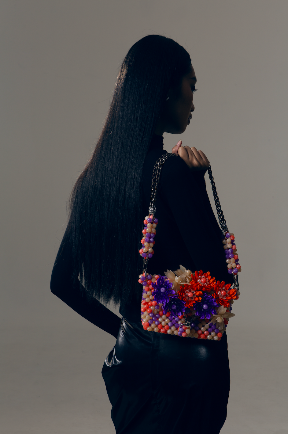 Handcrafted rossbody bag from marble beads. Spacious enough to fit a smartphone (up to iPhone Pro Max), wallet, and car keys. Features detailed acrylic and resin flower petal embellishments, secured with a metal clip closure, and comes with a detachable strap.