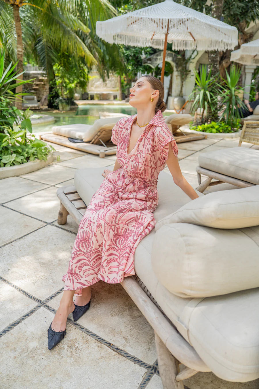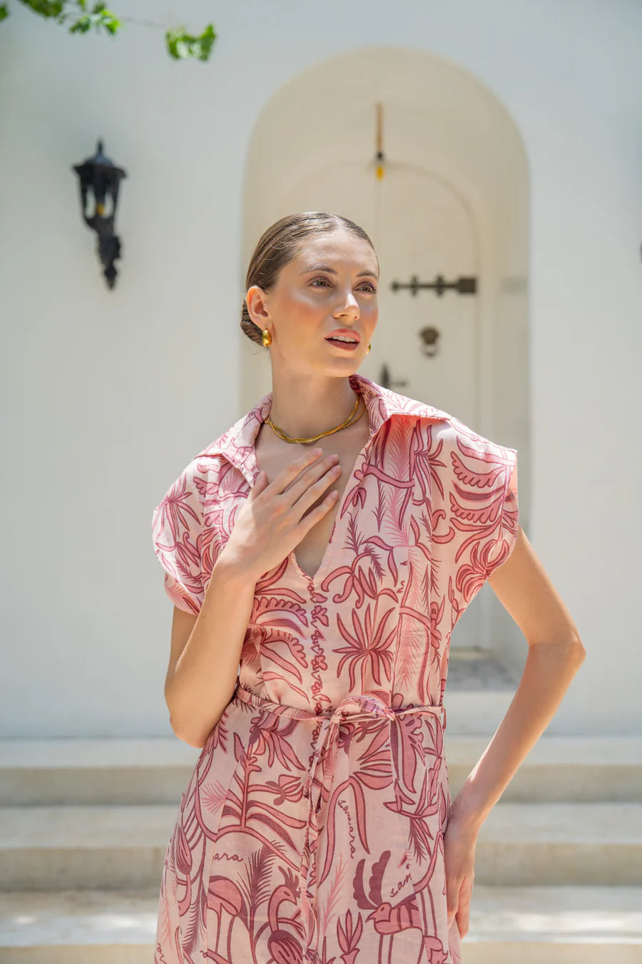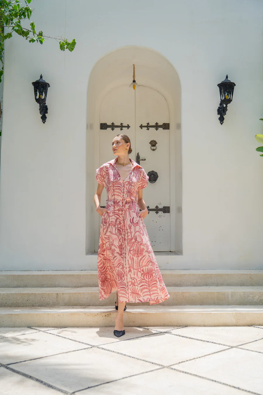 A wing collar shirt dress adorned with an all-over palm tree print. Effortless, vacation-ready style. 100% natural linen