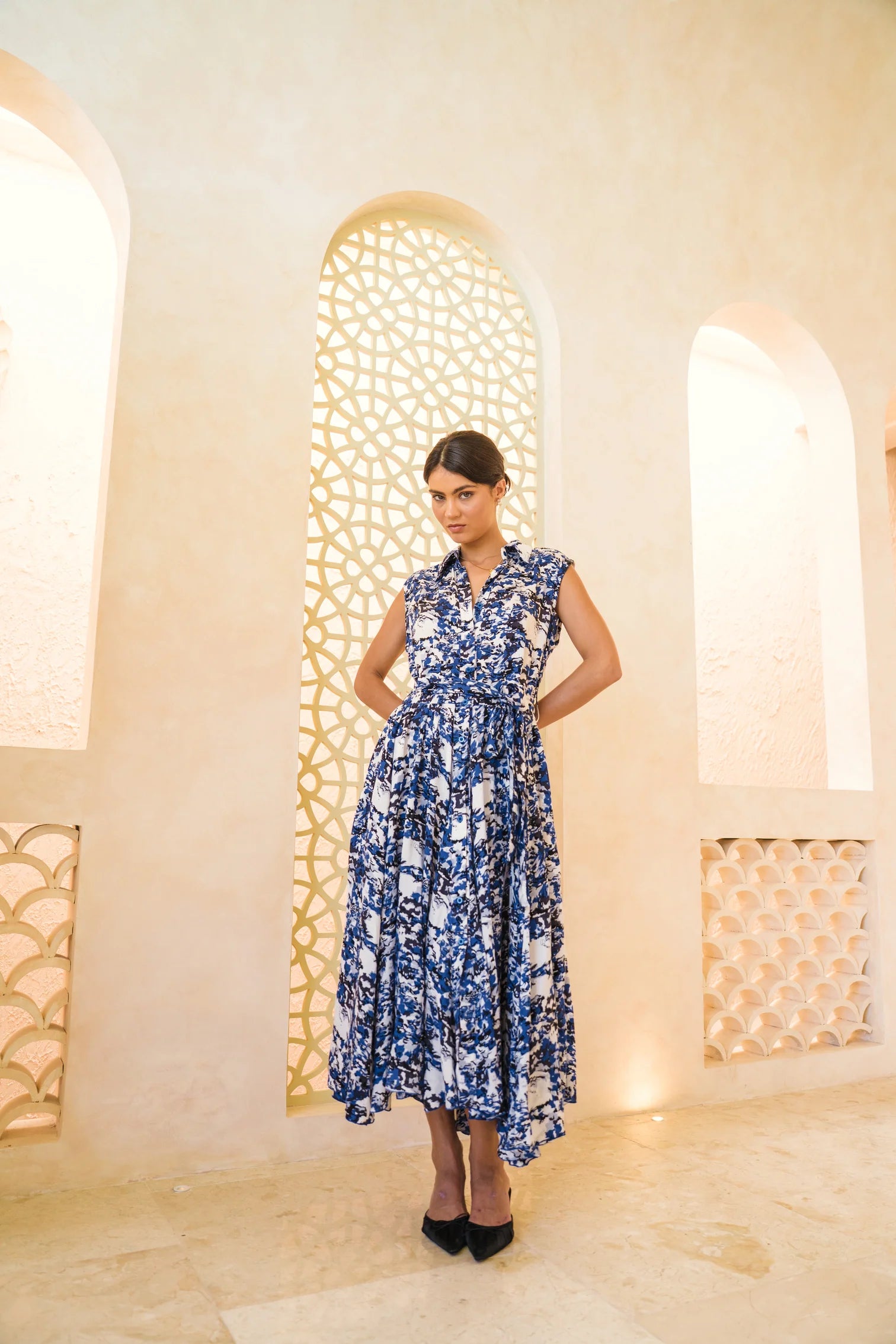 The Laksmi Flow Dress is a chic midi dress adorned with a soft blue floral pattern, perfect for a stylish vacation look. Its elegant wing collar and sleeveless design keep it breezy yet polished, ideal for effortless getaway glam.
