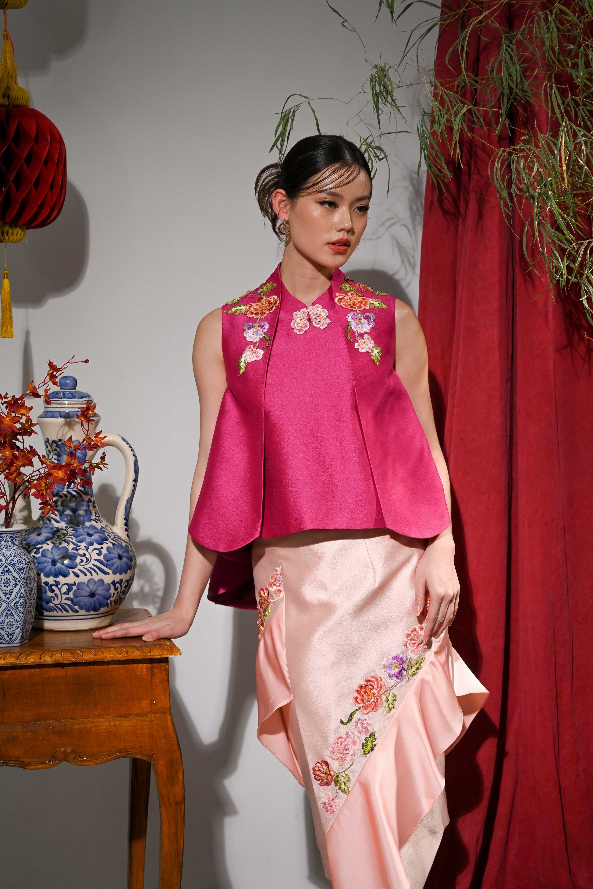 Midi length skirt with a dramatic asymmetrical ruffled hemline that sweeps diagonally across the front. A trail of floral embroidery follows the curve of the ruffle