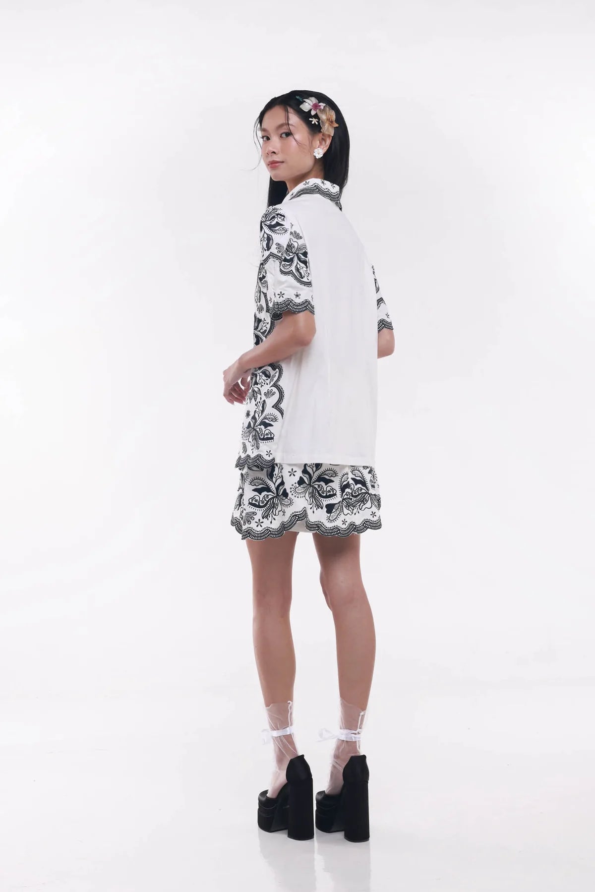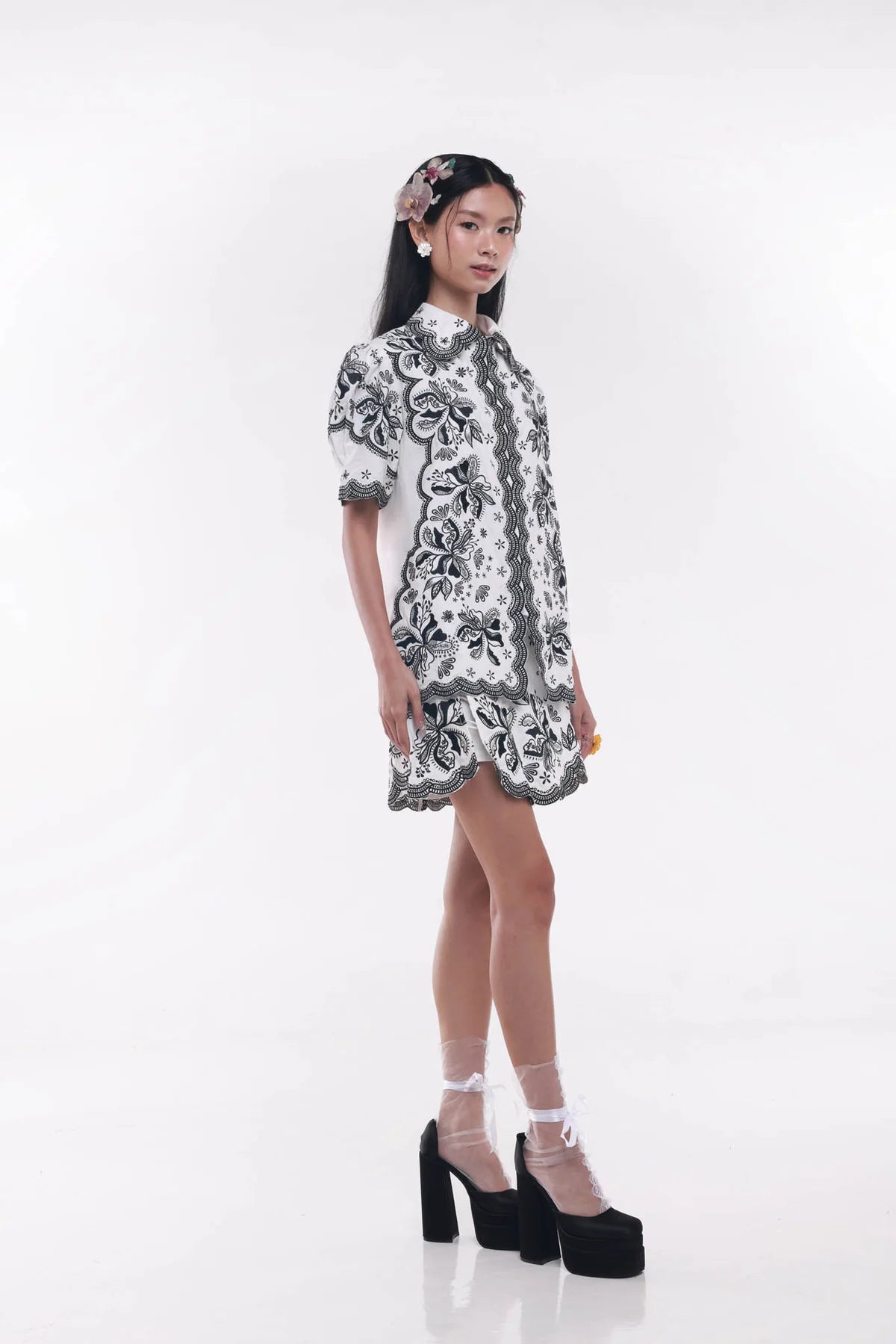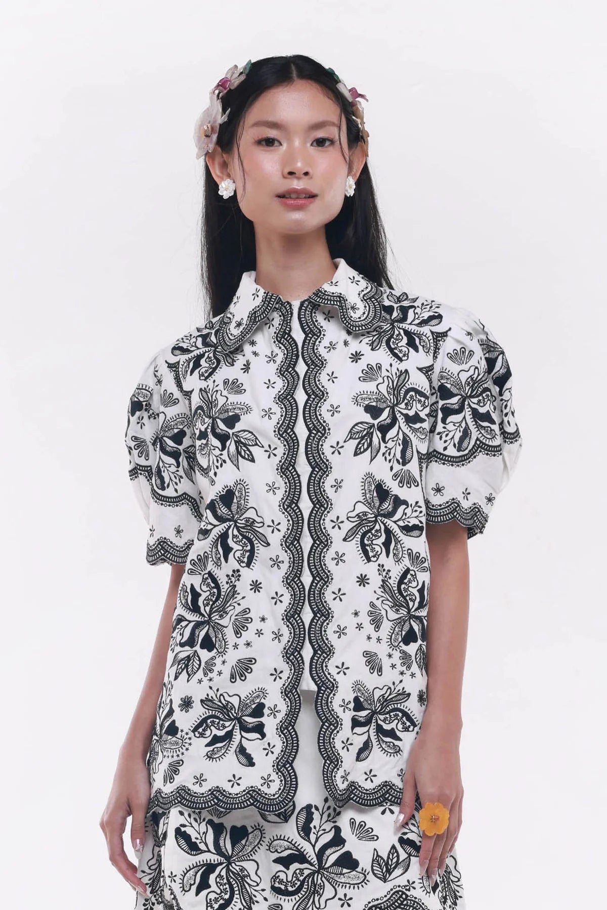 Chromatique Top redefines elegance with its bold monochrome floral embroidery and refined silhouette. Featuring structured puff sleeves and a scalloped-edge front panel, this statement piece blends modern artistry with timeless femininity. Each embroidery takes 16 hours of meticulous craftsmanship, making it a true wearable artwork.