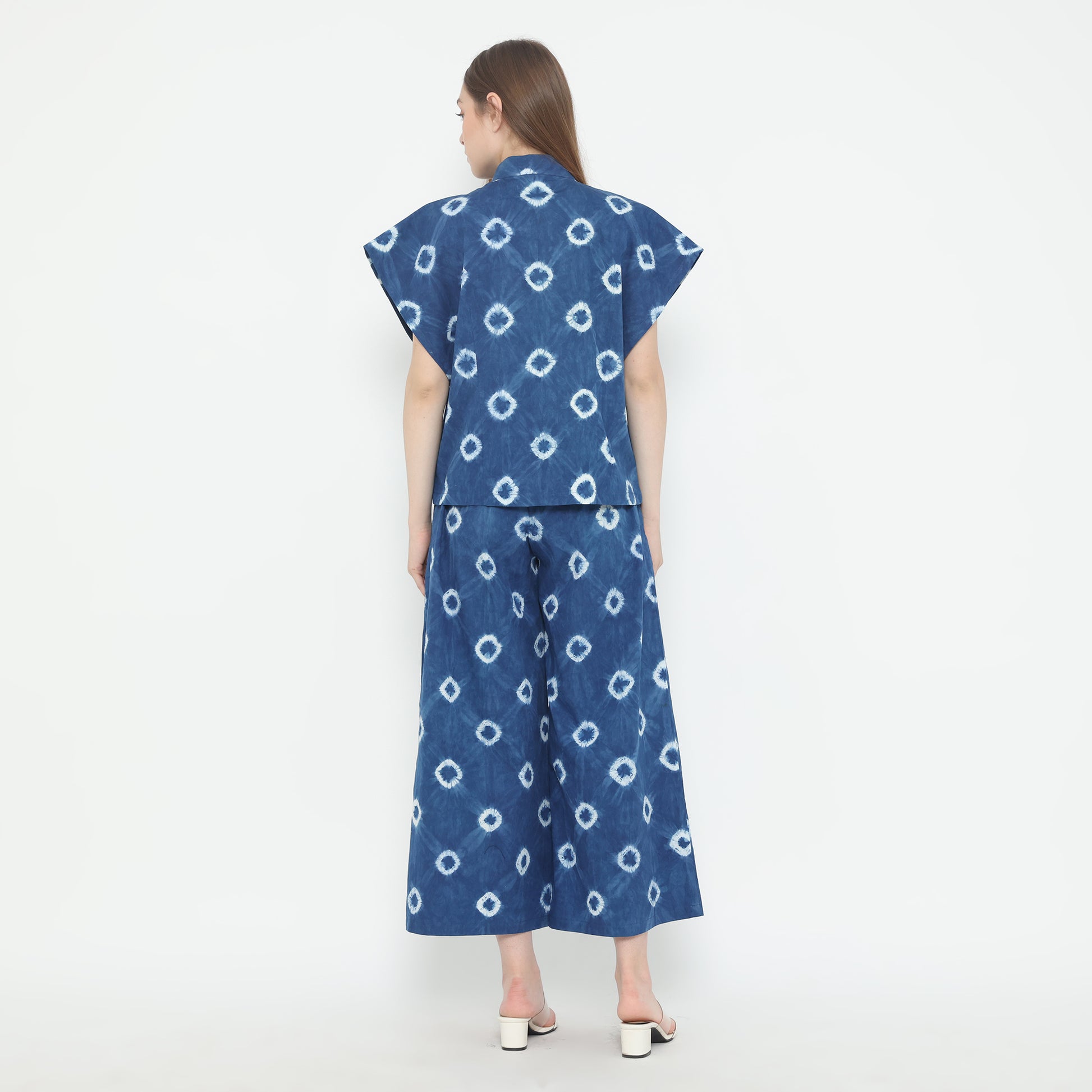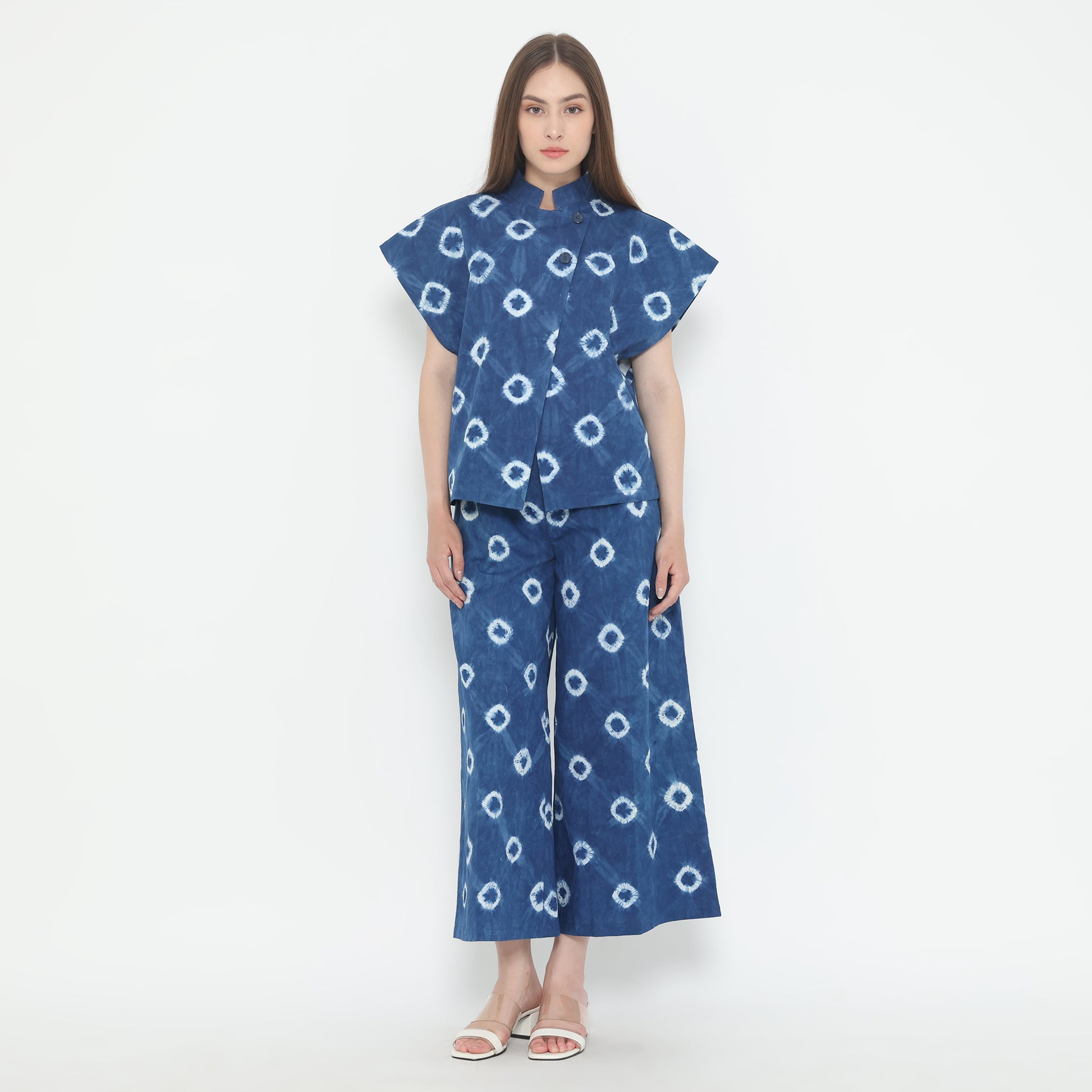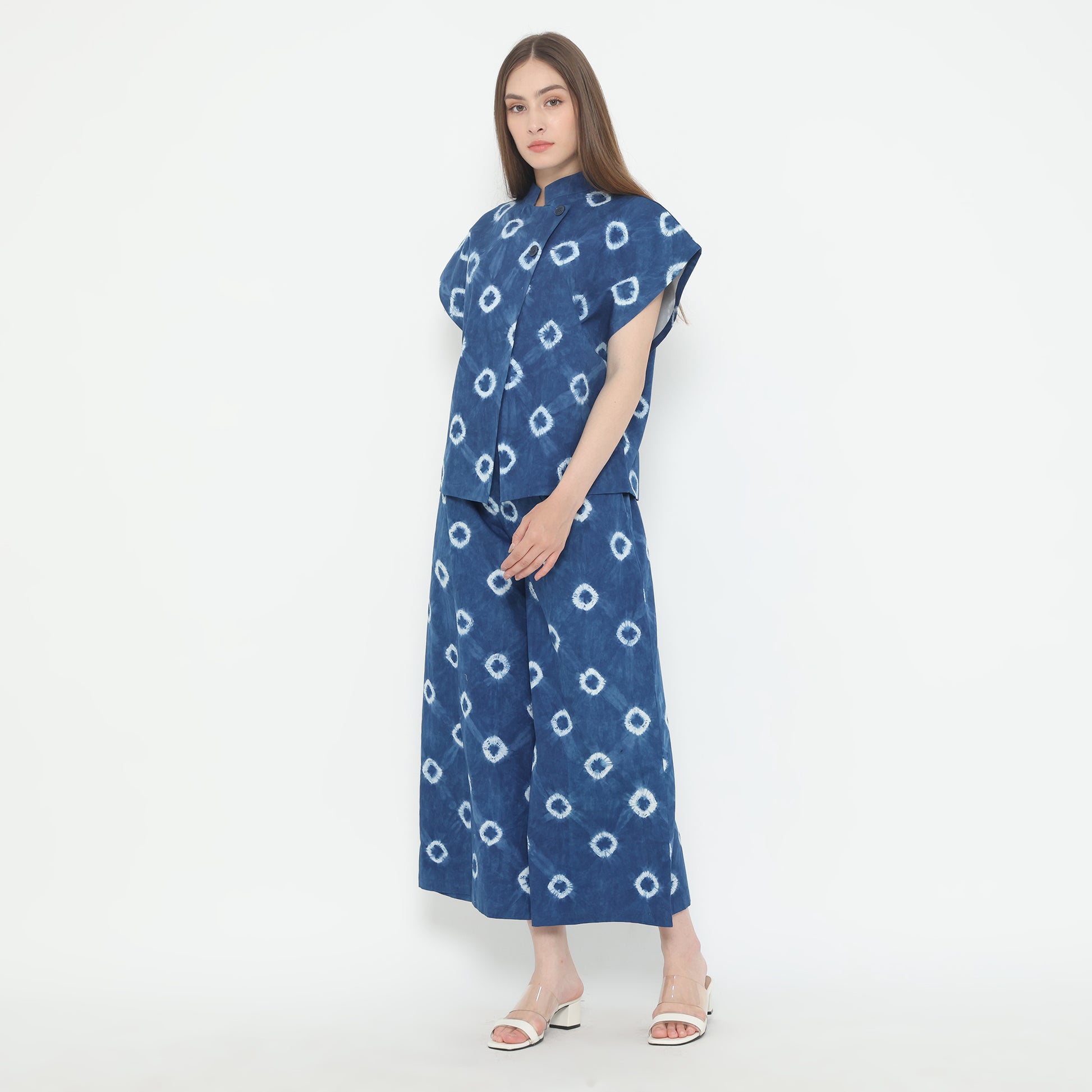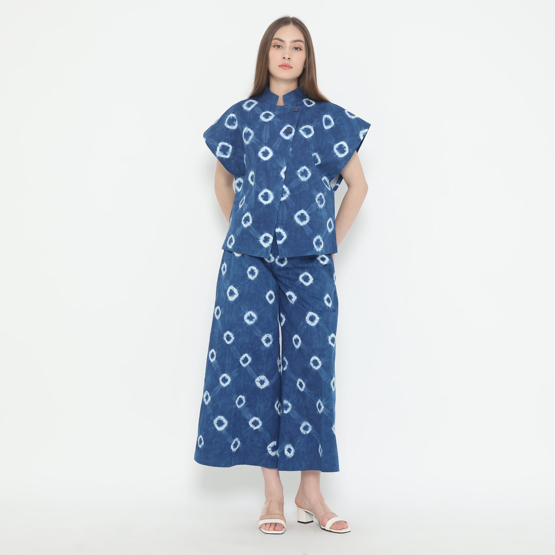 Top Osaka combining simple and minimalist styles with eye-catching patterns, from 100% natural cotton based on tie-dye techniques using natural ingredient. The blue colour made from indigofera tinctoria