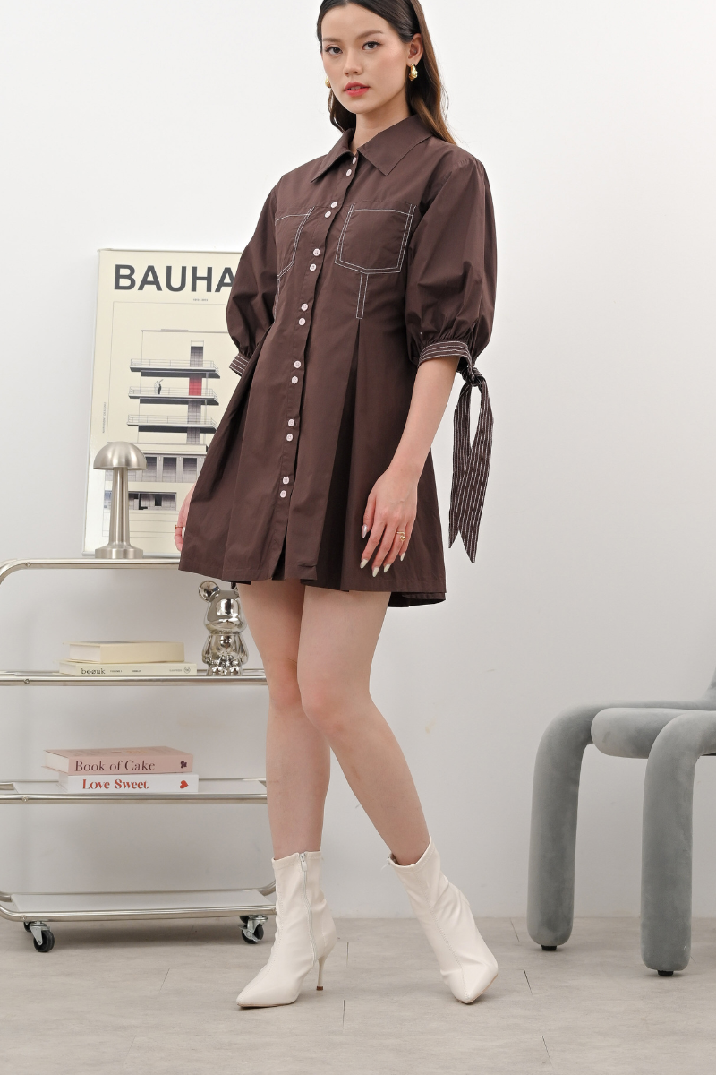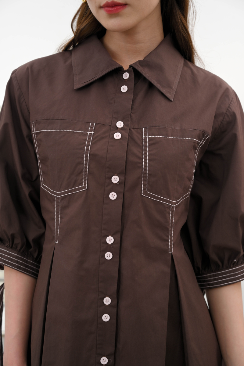 This mini shirt dress combines a sharp collared neckline with soft puff sleeves tied at the cuffs and chic scarf details. Featuring contrast stitching for a bold touch and chest pockets, it’s a stylish mix of classic and modern femininity. Think of styling it as a mini dress or even long-top/outerwear. Available in two colors, Pink and Espresso.
